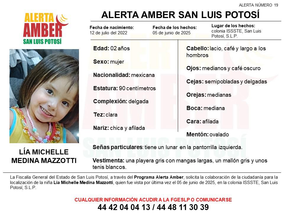 La Fiscalía General del Estado de San Luis Potosí (FGESLP) informa la activación de una ficha de Alerta Amber para la localización de la niña Lía Michelle Medina Mazzotti, quien tuvo contacto con su padre por última vez el 5 de junio de 2025, en la colonia ISSSTE de la capital potosina.