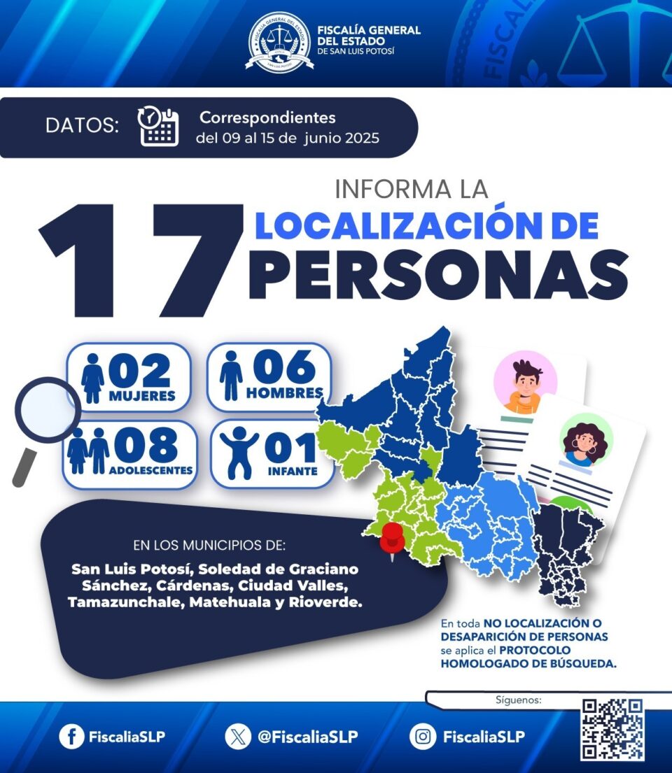 En la semana del 9 al 15 de junio de 2025, la Fiscalía General del Estado de San Luis Potosí (FGESLP) localizó a 17 personas que habían sido reportadas como no localizadas en la entidad potosina y que tenían activas fichas de búsqueda.