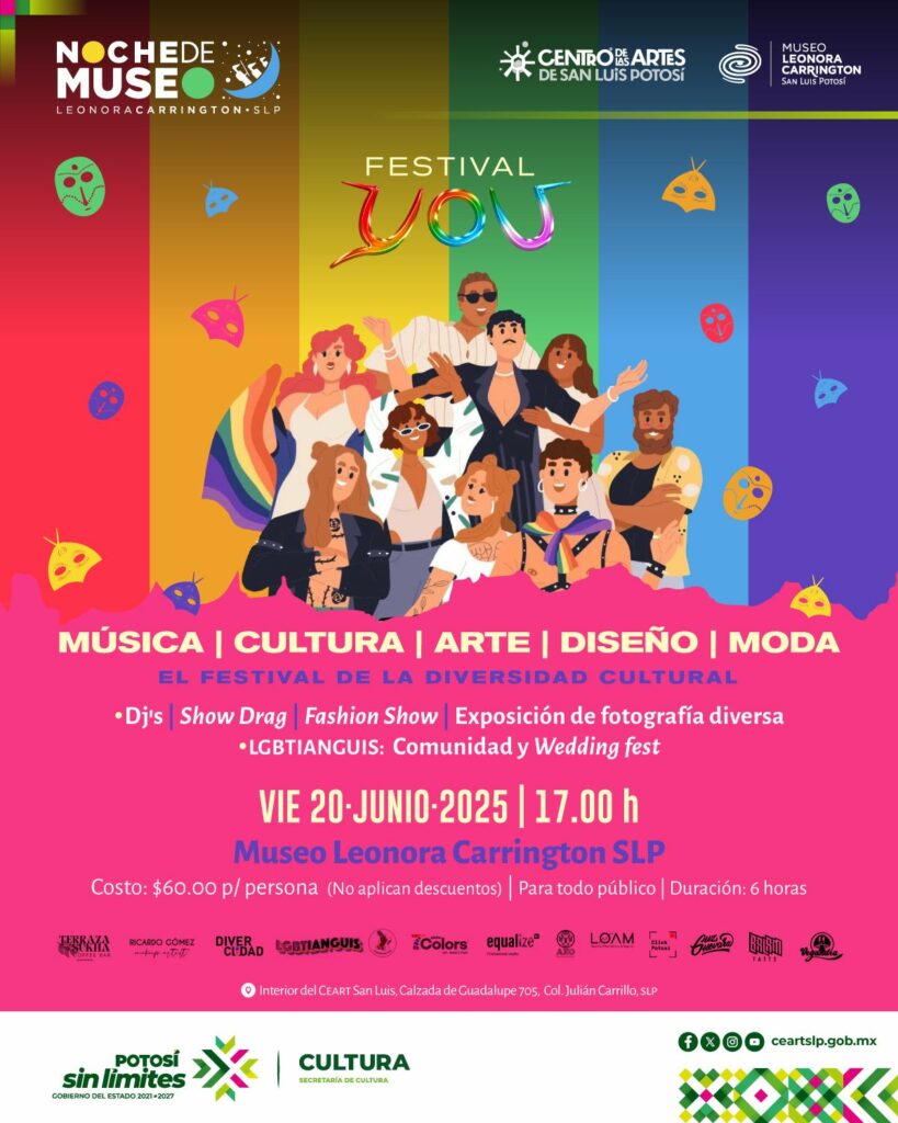 El Museo Leonora Carrington del Centro de las Artes de San Luis Potosí celebra este viernes 20 de junio la Noche de Museo con la temática del “Festival YOU”, un evento para manifestaciones de la diversidad, mediante eventos de música, arte, moda y comunidad.