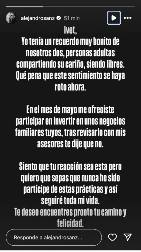 En respuesta a la denuncia, Alejandro Sanz publicó un mensaje dirigido a Ivet Playà en su histoira de Instagram. “Ivet, tenía un recuerdo muy bonito de nosotros dos, personas adultas compartiendo su cariño, siendo libres. Qué pena que este sentimiento se haya roto ahora”, expresó el cantante.