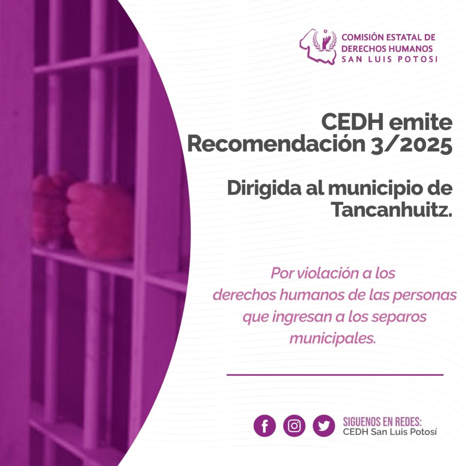 La Comisión Estatal de Derechos Humanos (CEDH), emitió la recomendación 03/2025 al Ayuntamiento de Tancanhuitz, por violación a los derechos humanos de las personas que ingresan a los separos municipales.