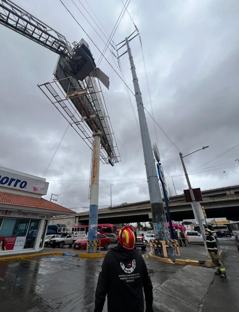 Ante el riesgo inminente que representaba para la ciudadanía, personal de Protección Civil Municipal de Soledad de Graciano Sánchez y el Cuerpo de Bomberos, retiraron un tramo de lámina que se desprendía de una estructura espectacular en el cruce de avenida San Pedro y Carretera a Matehuala.