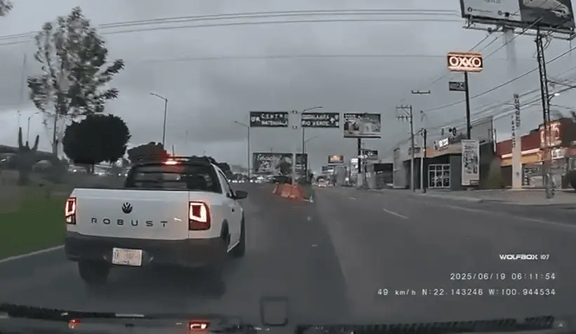 El video, tomado desde una unidad, muestra su recorrido por la lateral, a partir de la calle Luxemburgo y esta parte de la carretera 57, el vehículo intentaba incorporarse a los carriles centrales, cuando una camioneta VW Robust color blanco, placas que pudieran ser TK-1387-H, lo rebasa dese la izquierda y se le cierra.