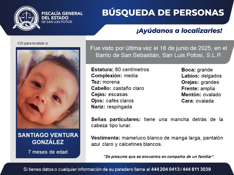 La Fiscalía General del Estado de San Luis Potosí (FGESLP) informa que se encuentran en curso las investigaciones relacionadas con la denuncia presentada por la madre de un infante de iniciales de S.V.G. de 7 meses de edad.