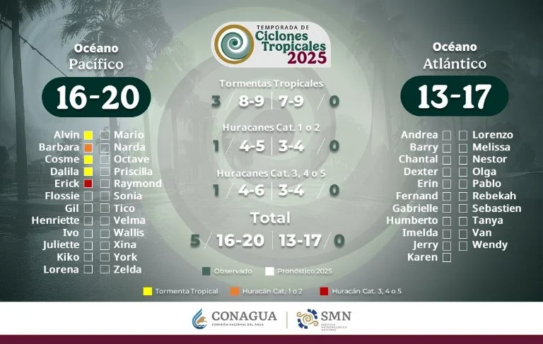 Para la temporada de huracanes 2025 se pronosticaron hasta 37 sistemas: de 16 a 20 en el Océano Pacífico y de 13 a 17 en el Océano Atlántico.