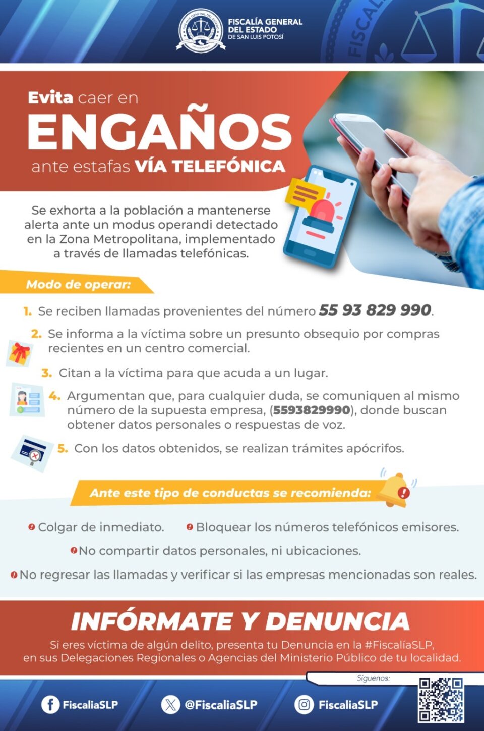 La Fiscalía General del Estado de San Luis Potosí (FGESLP) exhorta a la población a mantenerse alerta ante un modus operandi detectado recientemente en la Zona Metropolitana, implementado a través de llamadas telefónicas.