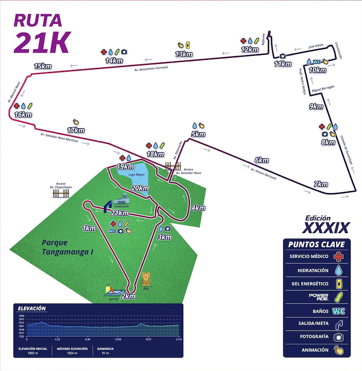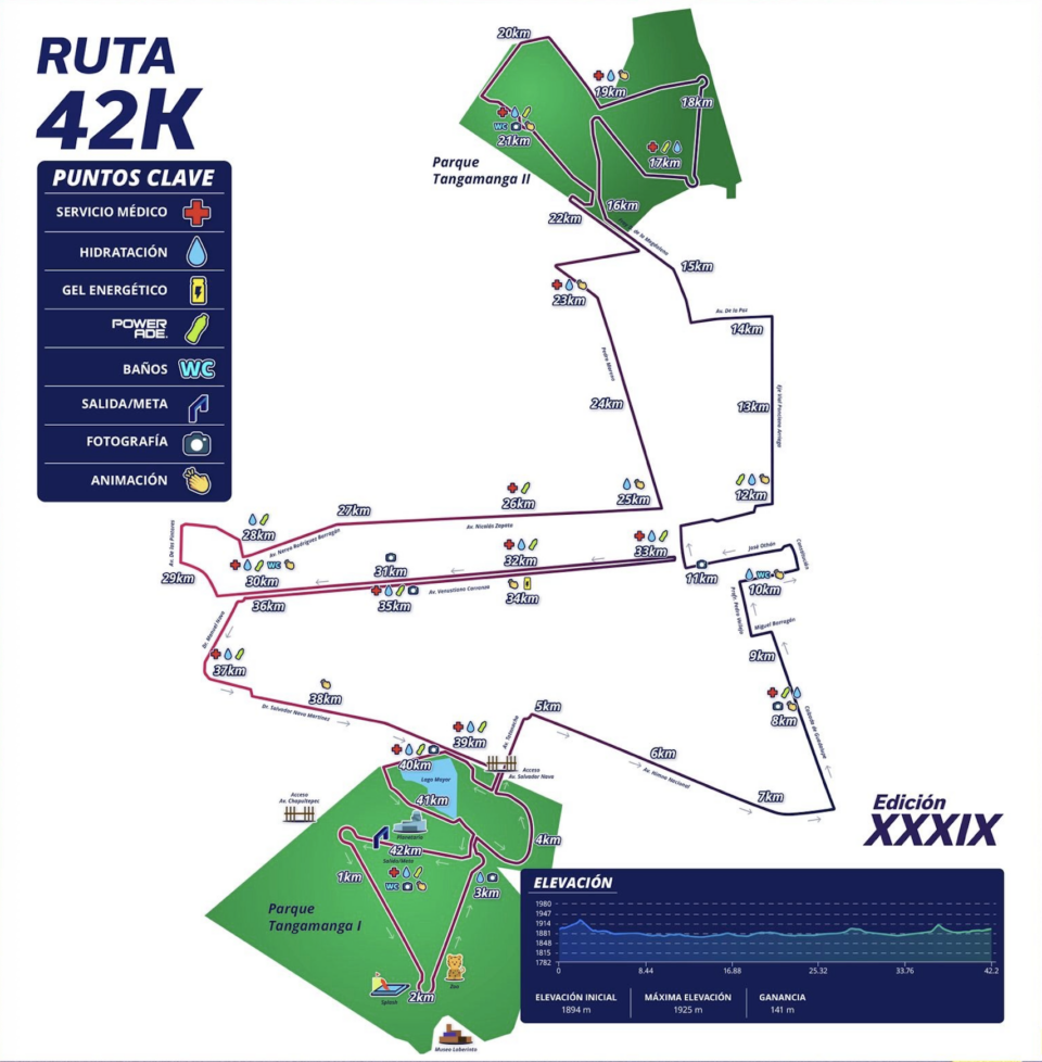 La salida del maratón será en el Parque Tangamanga I, frente al Planetario, y recorrerá las siguientes avenidas y calles: Paseo de los Potosinos Ilustres, Tatanacho, Himno Nacional, Calzada de Guadalupe, Zaragoza, Hidalgo, Álvaro Obregón, Escobedo, Insurgentes, Eje Vial Ponciano Arriaga, Avenida de la Paz, Damián Carmona, Fray Diego de la Magdalena y entrará al Parque Tangamanga II. Posteriormente, los corredores saldrán por avenida Saucito, regresarán por Fray Diego de la Magdalena, seguirán por avenida Hernán Cortés, Muñoz, Nereo Rodríguez Barragán, la Glorieta González Bocanegra, Himno Nacional y Tatanacho, para finalmente volver al Parque Tangamanga I.