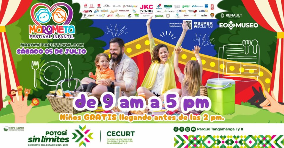 Tras haberse pospuesto por las fuertes lluvias, el Marometa Festival Infantil finalmente se llevará a cabo este sábado 5 de julio en el Ecomuseo del Parque Tangamanga I, con un nuevo horario de 9:00 de la mañana a 5:00 de la tarde.