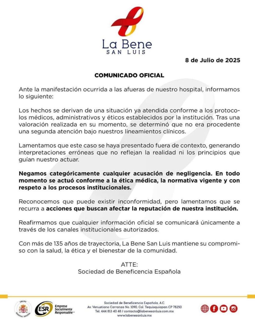 Negamos categóricamente cualquier acusación de negligencia. En todo momento se actuó conforme a la ética médica, la normativa vigente y con respeto a los procesos institucionales.