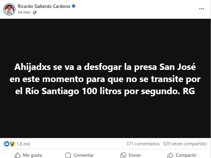 El gobernador del estado, Ricardo Gallardo Cardona anunció el desfogue de la presa San José este sábado, por lo que pide se evite el ingreso al boulevard Rio Santiago, ya que se tiraran 100 litros de agua por segundo.