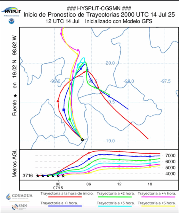 El modelo volcánico indica trayectorias de ceniza hacia el noroeste y norte del coloso, por lo que se prevé caída de ceniza en regiones del Valle de México.