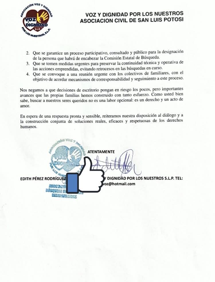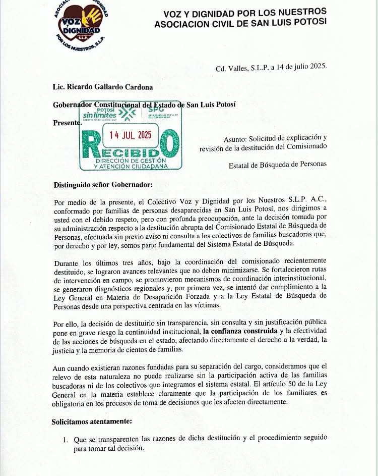 La asociación civil Voz y Dignidad por los Nuestros SLP se pronunciaron en contra del cambio de titular de la Comisión Estatal de Búsqueda, por lo que a través de un escrito solicitaron a Gobierno del Estado se transparente el movimiento.