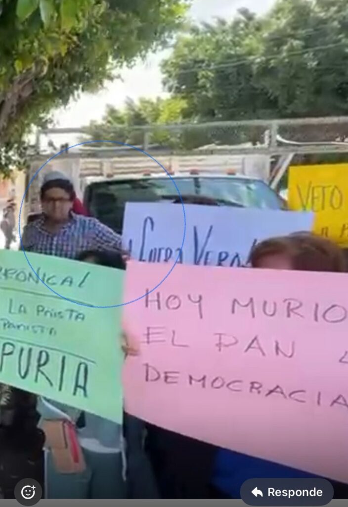 José Alejandro Zavala, Ramón Reynoso y José Miguel Delgado Torres, trabajadores de la legisladora en el Congreso del Estado, llegaron a boicotear el evento panista con pancartas con consignas como “Eres la priístas más panista”, “Espuria”, “Enrique Galindo manda en el PAN” y “Fuera Vero” en contra de Rodríguez y del alcalde Enrique Galindo.