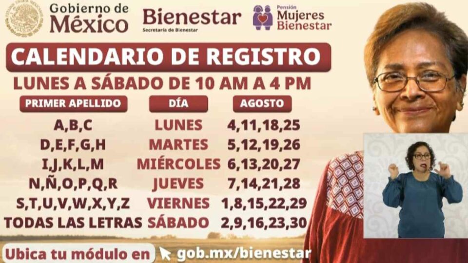 Ariadna Montiel, secretaria del Bienestar, anunció el inicio del registro para la pensión Mujeres-Bienestar, un apoyo económico de 3 mil pesos bimestrales dirigido a mujeres de 60 a 64 años. El trámite podrá realizarse del 1 al 30 de agosto, de lunes a sábado, en un horario de 10:00 a 16:00 horas, en los módulos instalados en todo el país. La ubicación de estos módulos ya puede consultarse en la página oficial de la Secretaría de Bienestar.