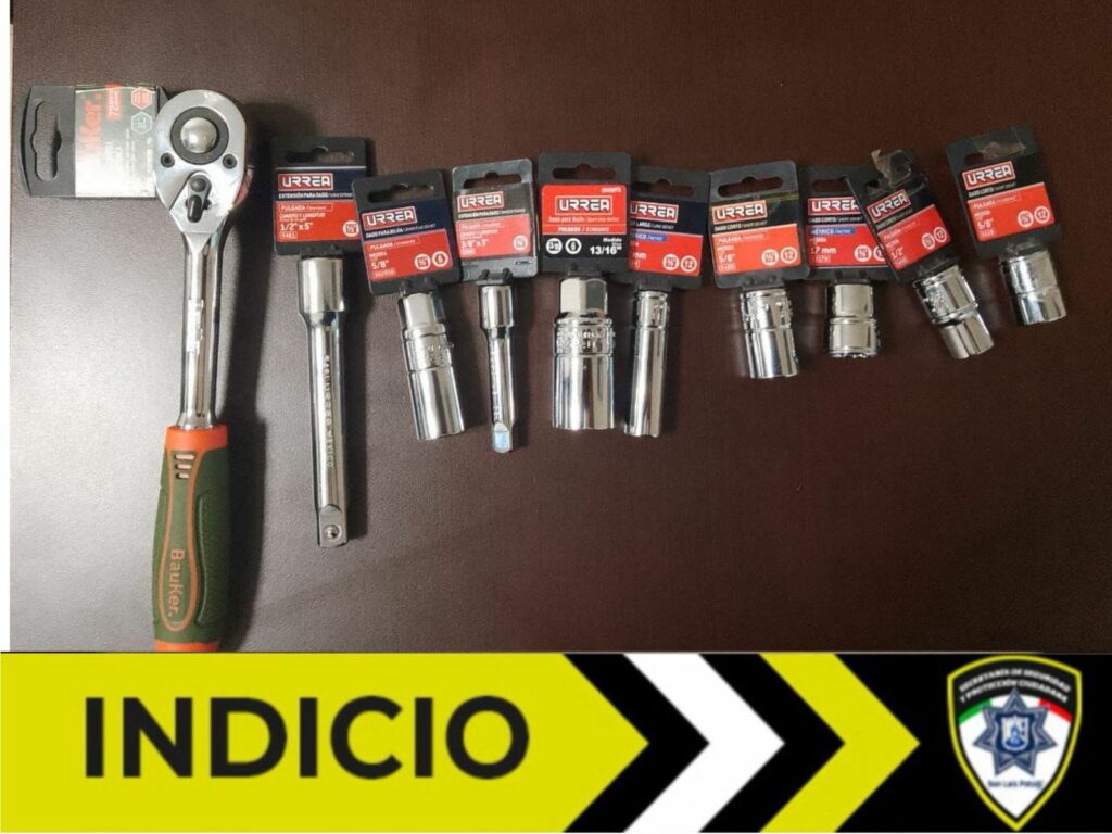 Los agentes municipales acudieron al lugar, encontrando al señalado de nombre Jorge Luis “N” de 54 años, a quien le indicaron el alto para una revisión de seguridad. De esta manera le encontraron dentro de una bolsa tipo mariconera, una matraca marca Bauker y 10 dados marca Urrea, productos que sustrajo del comercio, los cuales fueron valorados en 1 mil 379 pesos.