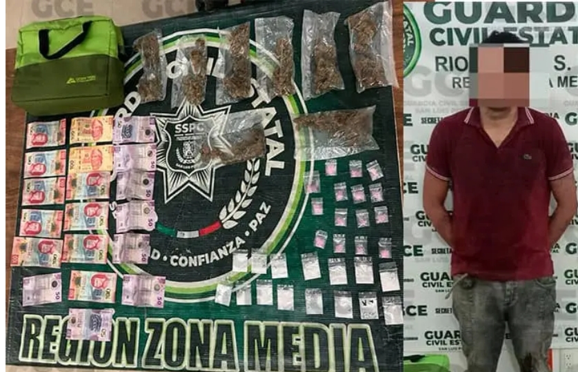 En una acción realizada en labores que buscan salvaguardar la paz en la Región Media, oficiales de la Guardia Civil Estatal detuvieron a un hombre por presuntos delitos contra la salud, asegurando 38 dosis de estupefacientes y enervantes, esto en el municipio de Rioverde.