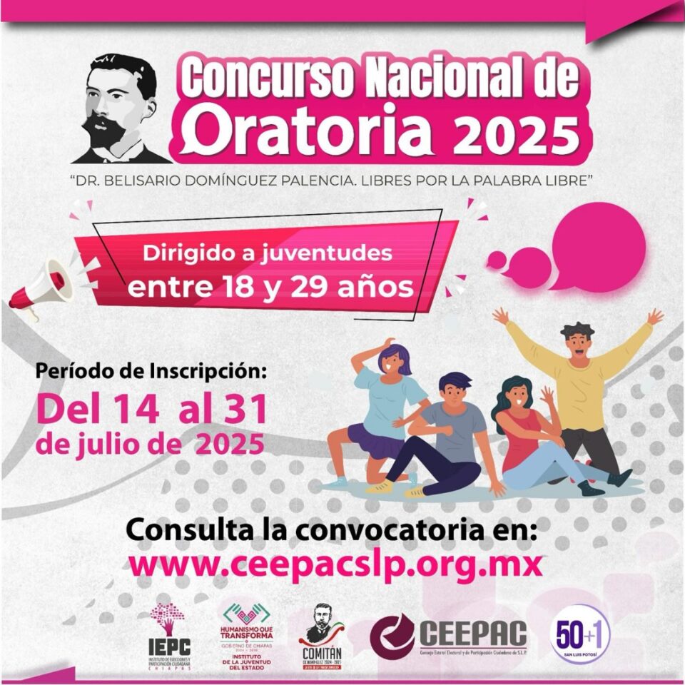El Consejo Estatal Electoral y de Participación Ciudadana, con la colaboración de la Colectiva 50+1 en San Luis Potosí, realizará la etapa estatal del Concurso Nacional de Oratoria 2025 “Dr. Belisario Domínguez Palencia. Libres por la palabra libre”, el próximo 13 de agosto; habrá premios para los tres primeros lugares y la persona ganadora representará al estado en el certamen final.