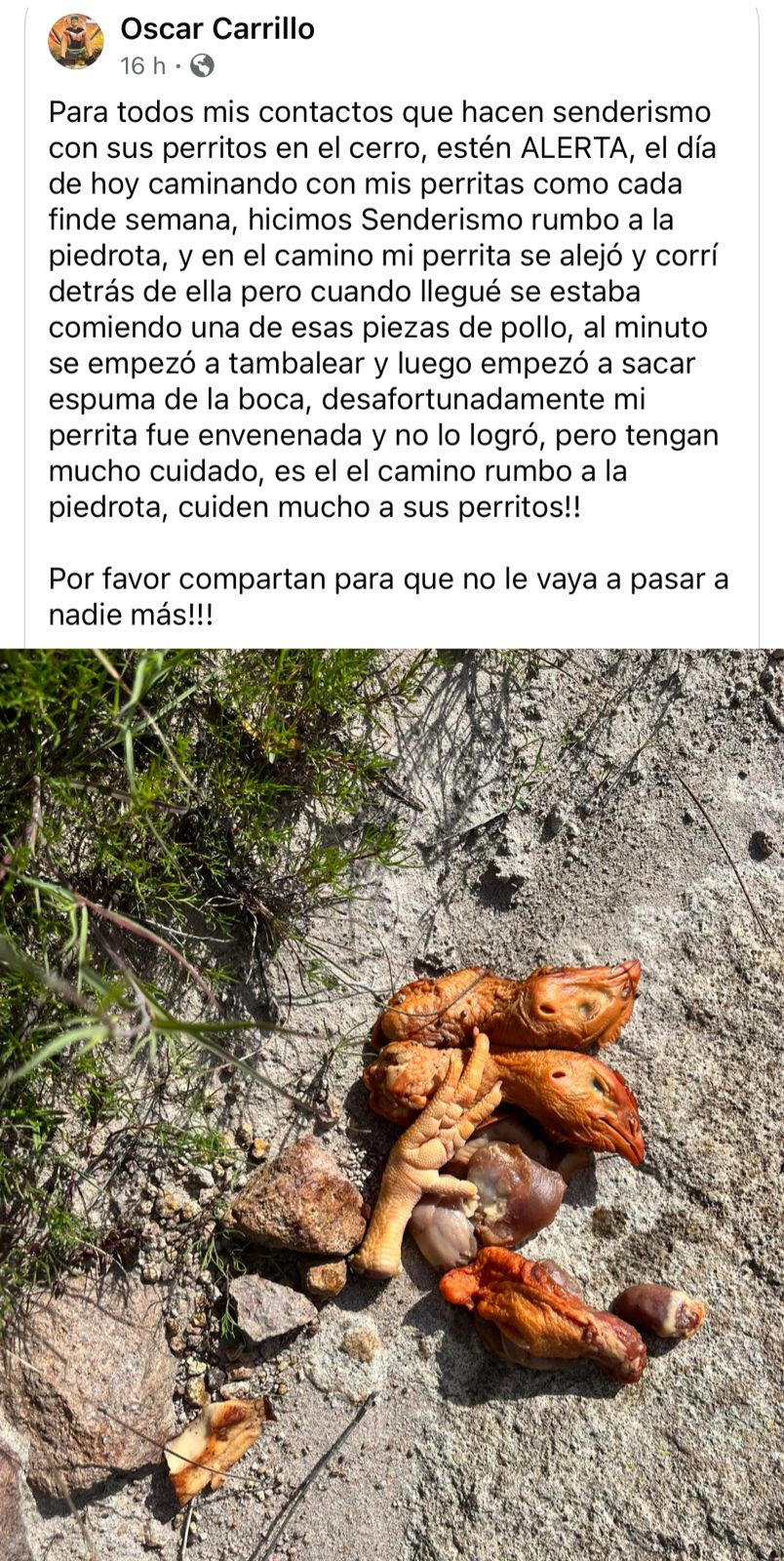 El fin de semana un usuario denunció en redes sociales que su perrita murió envenenada tras ingerir un trozo de pollo en el trayecto hacia el lugar conocido como La Piedrota.