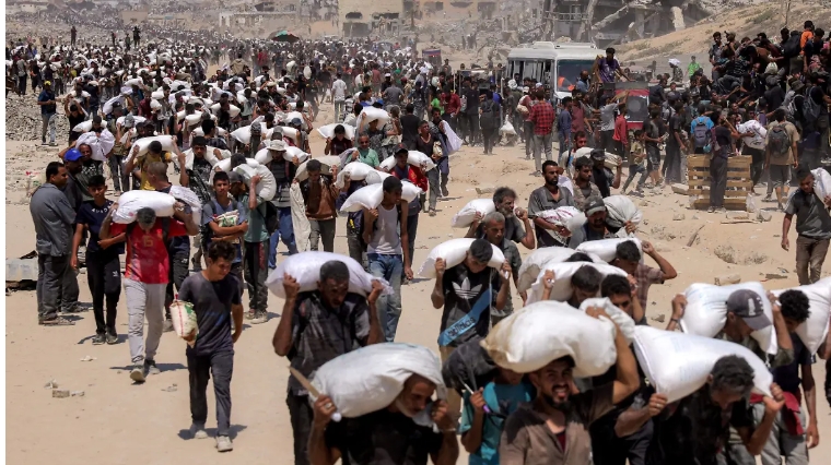 En Beit Lahia, en el norte de Gaza, las imágenes de AFP mostraron el domingo a multitudes de palestinos caminando por la arena entre las ruinas, cargando a sus espaldas sacos de harina que acababan de recoger en el puesto fronterizo de Zikim.