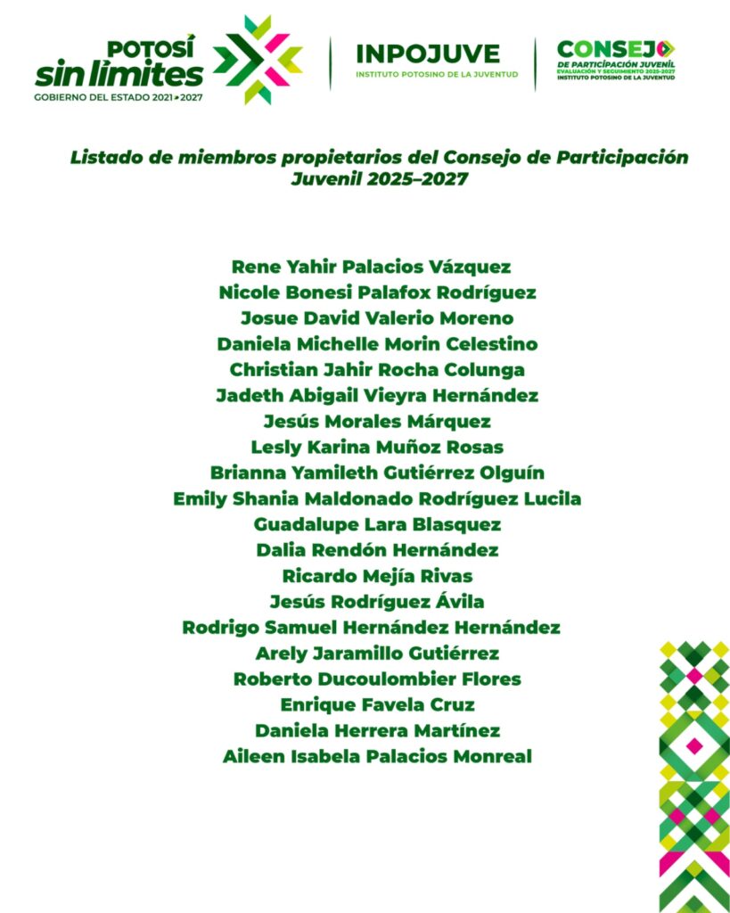 En el marco de la primera reunión extraordinaria de la Junta Directiva del Instituto Potosino de la Juventud (Inpojuve), se dio a conocer la integración del Consejo de Participación Juvenil, Evaluación y Seguimiento 2025–2027, que garantiza una participación amplia y representativa de la juventud.