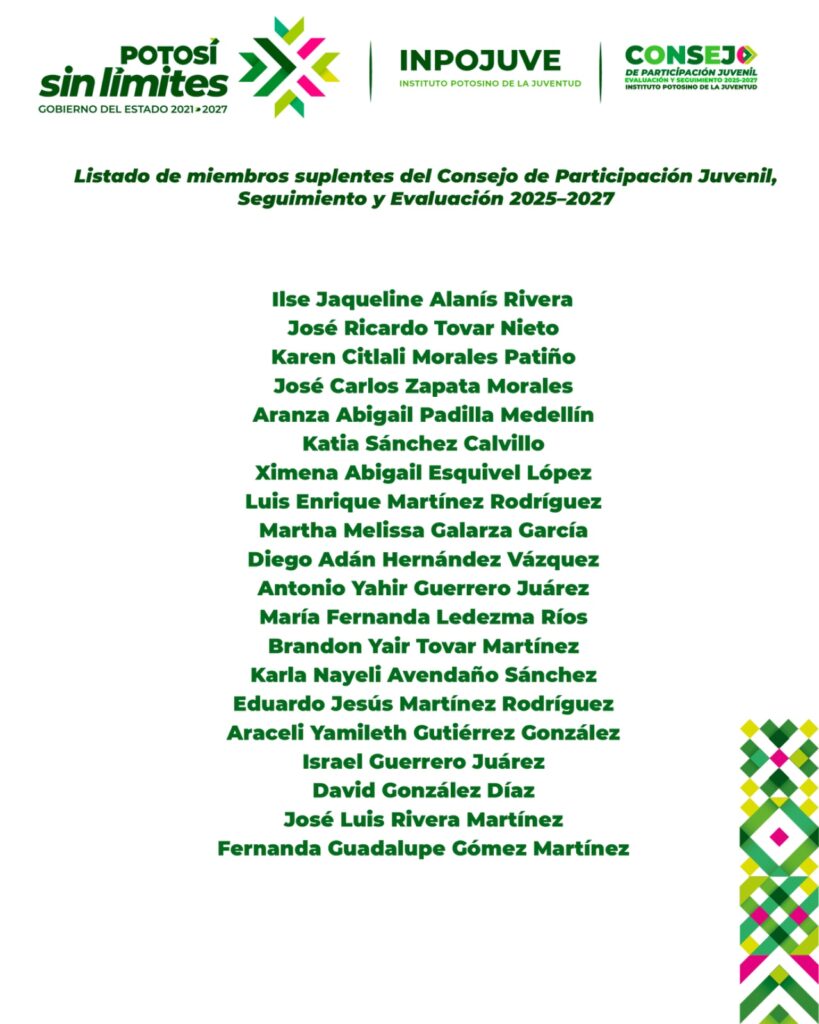 Asimismo, entre los miembros suplentes figuran jóvenes igualmente destacados como Ilse Jaqueline Alanís Rivera, José Ricardo Tovar Nieto, Karen Citlali Morales Patiño, José Carlos Zapata Morales y Aranza Abigail Padilla Medellín, quienes tendrán la responsabilidad de acompañar y reforzar las tareas del Consejo en caso de ser requeridos.