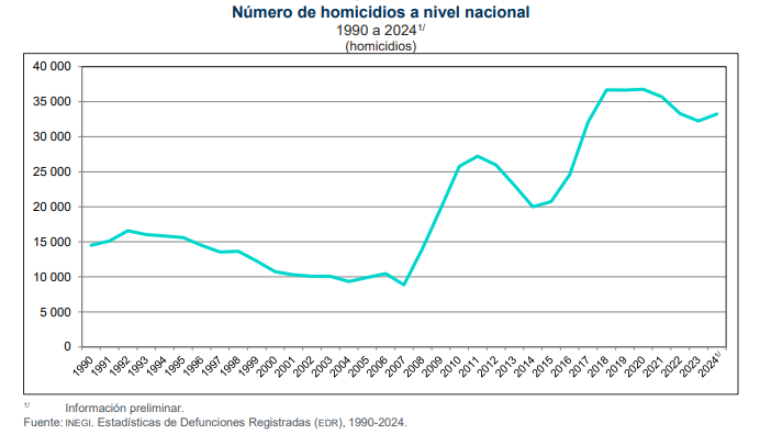 Durante 2024, el INEGI registró 33 mil  241 defunciones por homicidio. La tasa nacional fue de 25.6 homicidios por cada 100 mil habitantes, superior a la de 2023, que fue de 24.9.