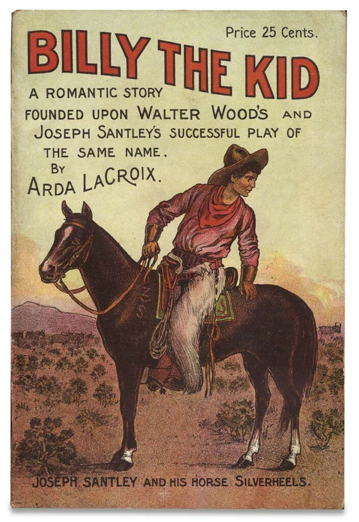 La segunda imagen es la portada de una novelita escrita por un adolescente en 1905-1907. Joseph Santley (1890-1971) tenía quince años cuando escribió, con su amigo y coetáneo Walter Woods, una versión teatral que tuvo un éxito impresionante en el teatro Star de Broadway. Santley mismo interpretaba a Billy y es probablemente uno de los primeros niños-estrella de la farándula estadounidense. James B. Mills descubrió que el Buffalo Courier de Nueva York publicó, el 10 de Septiembre de 1907, que Santley “es acaso el más grande niño-actor en los escenarios de hoy, y atrae grandes audiencias”. (Liga 6.) Santley, Woods y su compañía recorrieron los EUA y Canadá con gran éxito –difundiendo aún más la fama de Billy The Kid como héroe salvaje.
