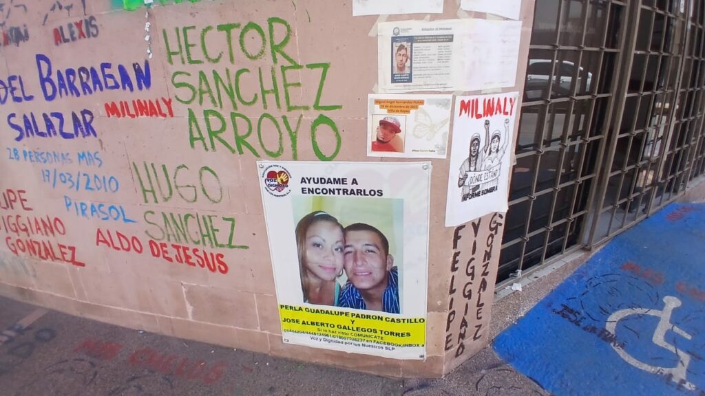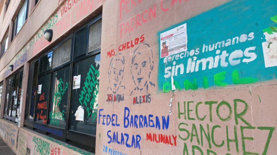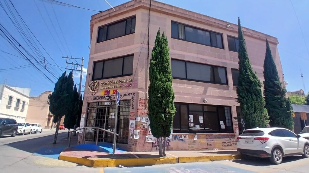 A mes y medio de que, el colectivo Voz y Dignidad por los Nuestros SLP intervino las instalaciones de la Comisión Estatal de Derechos Humanos (CEDH), continua con los nombres de las víctimas de desaparición y en algunos casos hasta sus rostros, pintados o pegados en la fachada del organismo.