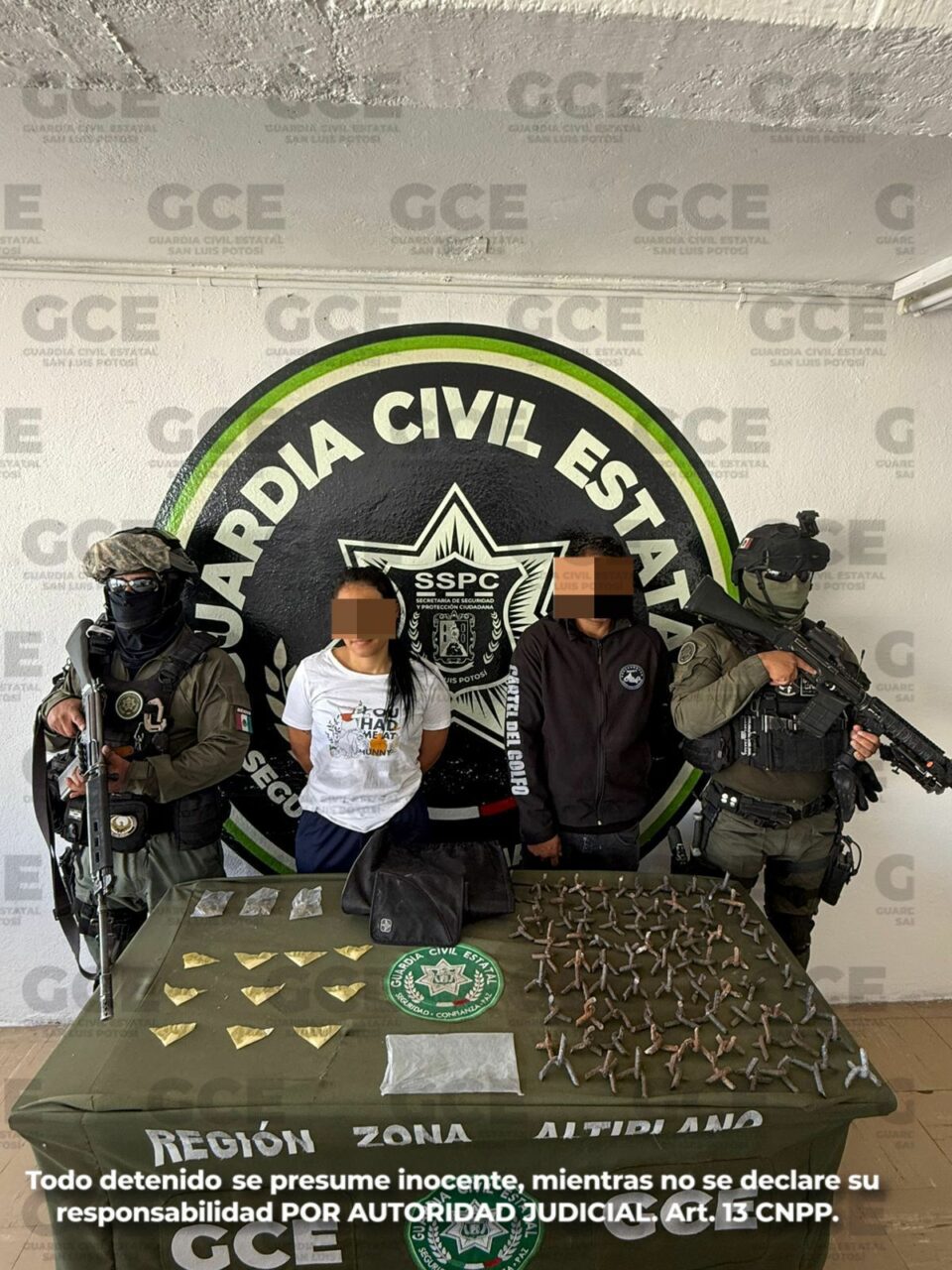 Matehuala, S.L.P.- Derivado del Plan Integral de Seguridad a cargo del Estado, oficiales de la Guardia Civil Estatal, llevaron a cabo la detención de una pareja por presunta portación de armas prohibidas (poncha llantas) y posesión de droga.