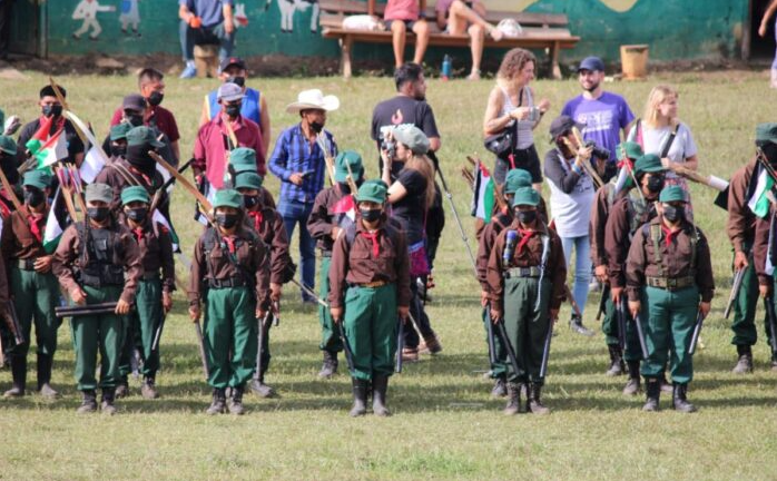 La jornada inaugural reunió a cientos de milicianas y milicianos zapatistas, quienes desfilaron en completo silencio portando uniformes verde y café, arcos y lanzas, así como banderas palestinas.