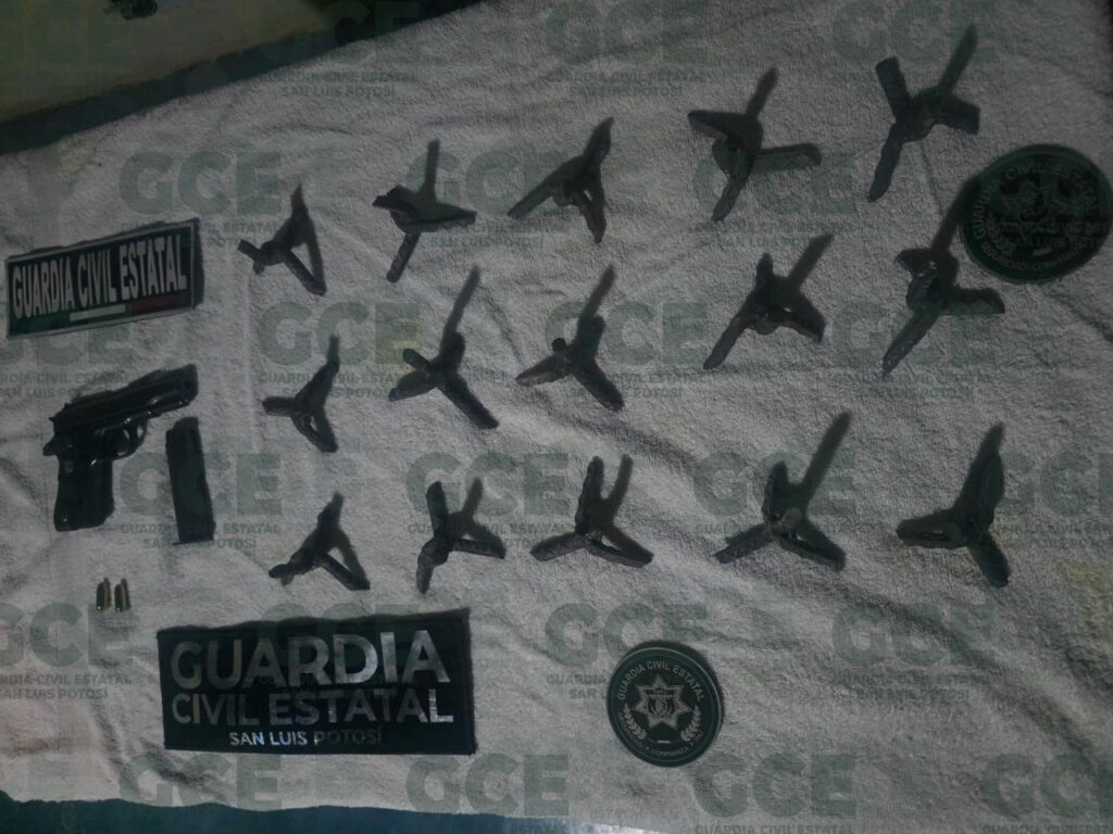 Un operativo efectuado por nuestros elementos de la Guardia Civil Estatal en el municipio de Catorce derivó en la detención de Antonio “N” de 33 años y de Adelaido “N” de 18 años, a quienes se les aseguró en Estación Catorce, un arma de fuego calibre .380, abastecido con dos cartuchos útiles, 15 artefactos metálicos conocidos como “poncha llantas” y un automóvil Toyota color blanco, modelo 2021 con placas del estado de Guerrero.