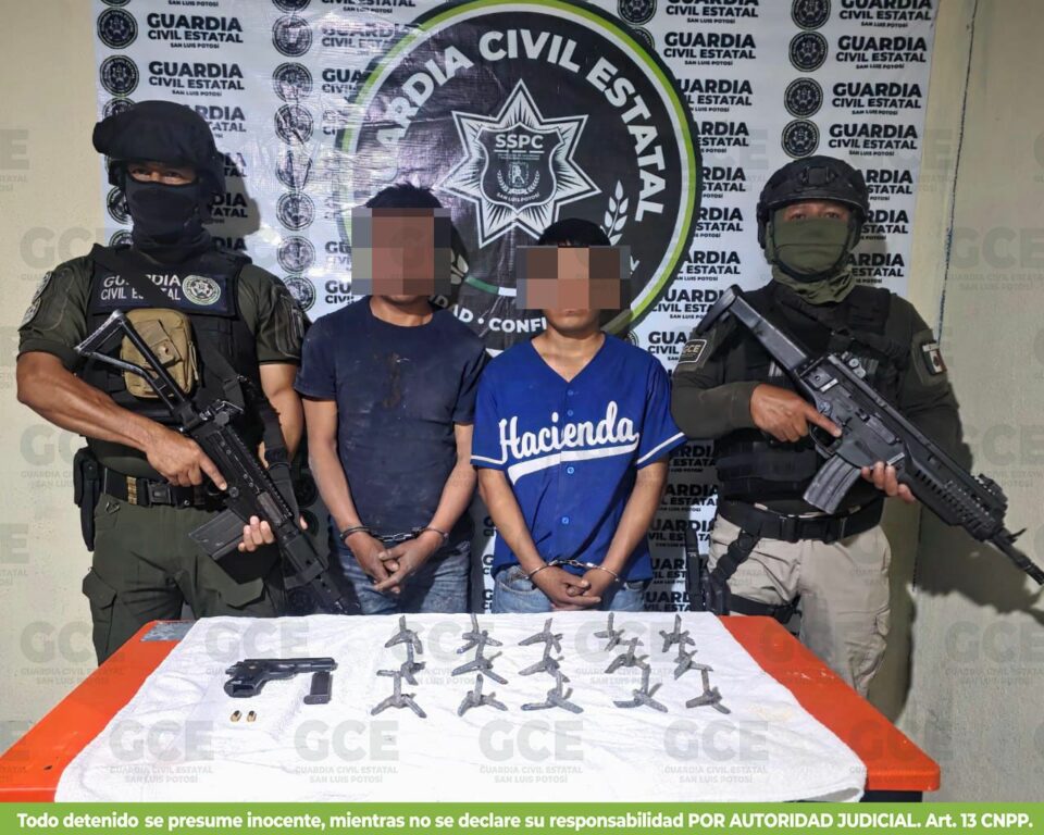 Un operativo efectuado por nuestros elementos de la Guardia Civil Estatal en el municipio de Catorce derivó en la detención de Antonio “N” de 33 años y de Adelaido “N” de 18 años, a quienes se les aseguró en Estación Catorce, un arma de fuego calibre .380, abastecido con dos cartuchos útiles, 15 artefactos metálicos conocidos como “poncha llantas” y un automóvil Toyota color blanco, modelo 2021 con placas del estado de Guerrero.
