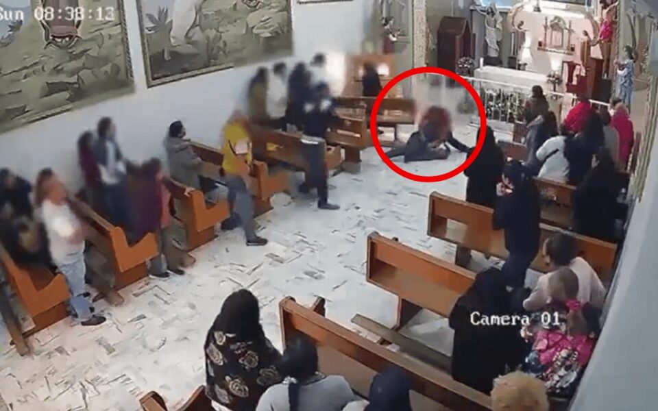En un video que circula en redes sociales se observa el momento en el que un hombre que se encontraba en la primera fila del templo religioso la abandona para acercase con un cuchillo a otro feligrés.