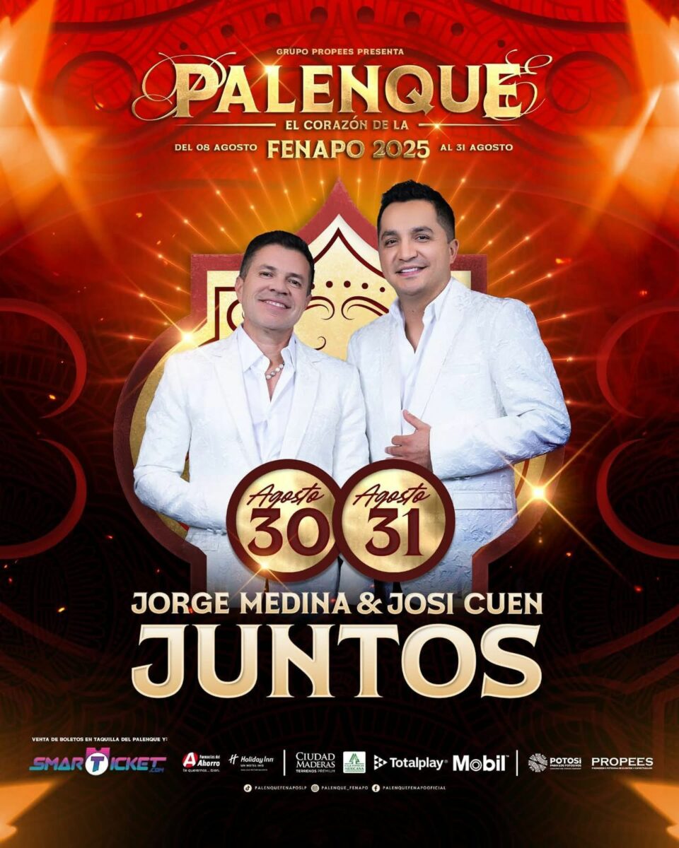 Este 30 y 31 de agosto, el Palenque se llenará de sentimiento, banda y mucha fiesta con la presentación estelar de Jorge Medina & José Cuen, dos grandes voces del regional mexicano… ¡por primera vez juntos en el escenario!