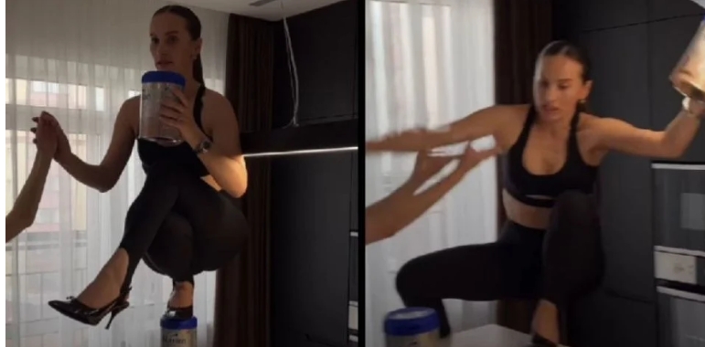 Apenas ocho semanas después de haber dado a luz a su primer hijo, Barutkina decidió grabar contenido para su blog. El reto consistía en replicar una compleja pose sobre una encimera de cocina, usando tacones de aguja y apoyándose sobre un frasco de comida para bebé colocado sobre una cacerola.
