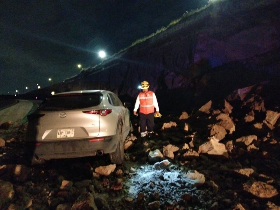 Personal de Protección Civil y Policía Vial acudieron al reporte del desprendimiento de rocas, lo que provocó el bloqueo de dos carriles en dirección sur de Prolongación Calzada de Guadalupe. En el incidente se vio afectado un vehículo tipo sedán, marca Mazda, cuyo conductor circulaba por el lugar al momento del deslizamiento. Afortunadamente, no se reportaron personas lesionadas.