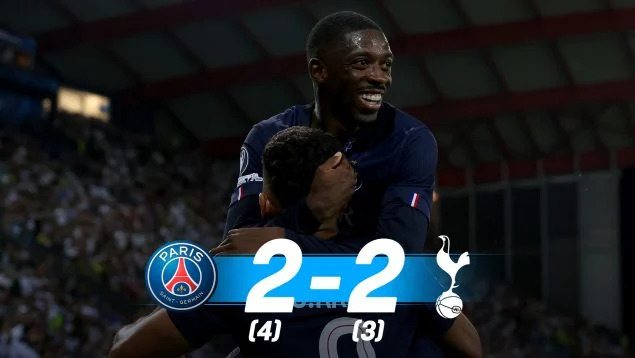 Así, el duelo se fue a la tanda. Allí se decidiría el campeón de la Supercopa. Solanke golpeaba primero, fuerte a la escuadra, sin que pudiera hacer nada Chevalier, pese a que adivinó la dirección. La mandó fuera Vitinha y Betancur aprovechó para poner el 2-0 cambiándola a la otra escuadra. Gonçalo Ramos cumplió y apareció Chevalier para parar la pena máxima de Van de Ven. Dembélé igualaba a dos tras tres lanzamientos de cada uno. Tel volvió a fallar para los spurs y tenía la oportunidad Kang-in de adelantar a los franceses. Lo aprovechó. Porro la clavó en el ángulo, pero Nuno Mendes no perdonó y proclamó supercampeón al PSG.