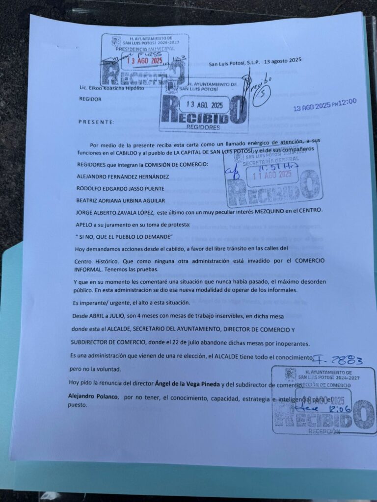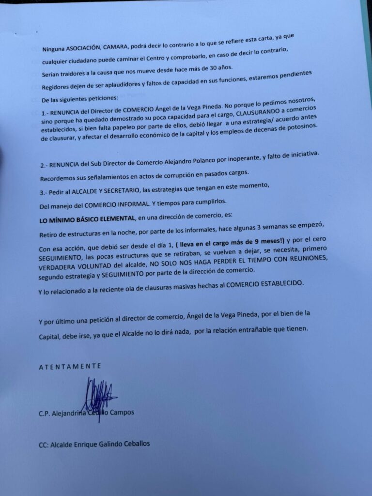 Alejandrina Cedillo Campos, empresaria del Centro Histórico, presentó esta mañana una carta dirigida a los regidores del Ayuntamiento de San Luis Potosí en la que denuncia lo que calificó como una “nula actuación” de la Dirección de Comercio de la administración que encabeza Enrique Galindo, para ordenar el comercio informal en la ciudad, al tiempo que acusó un “constante hostigamiento” al comercio formal mediante clausuras masivas sin previo intento de regularización.