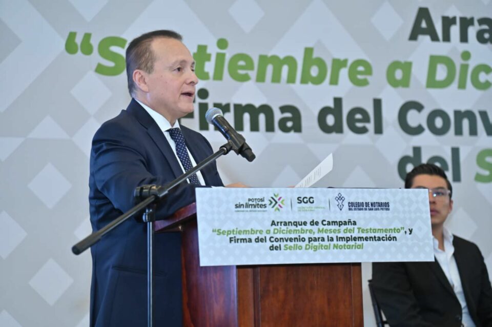 Durante la presentación de la Jornada Notarial “Meses del Testamento”, los presidentes del Colegio Nacional y Estatal del Notariado Mexicano, Ricardo Vargas Navarro y Juan Carlos Barrón Cerda, respectivamente, reconocieron esta campaña que inicia el 1º de septiembre, enfocada en fomentar la previsión patrimonial y la protección familiar en beneficio directo de las familias potosinas.