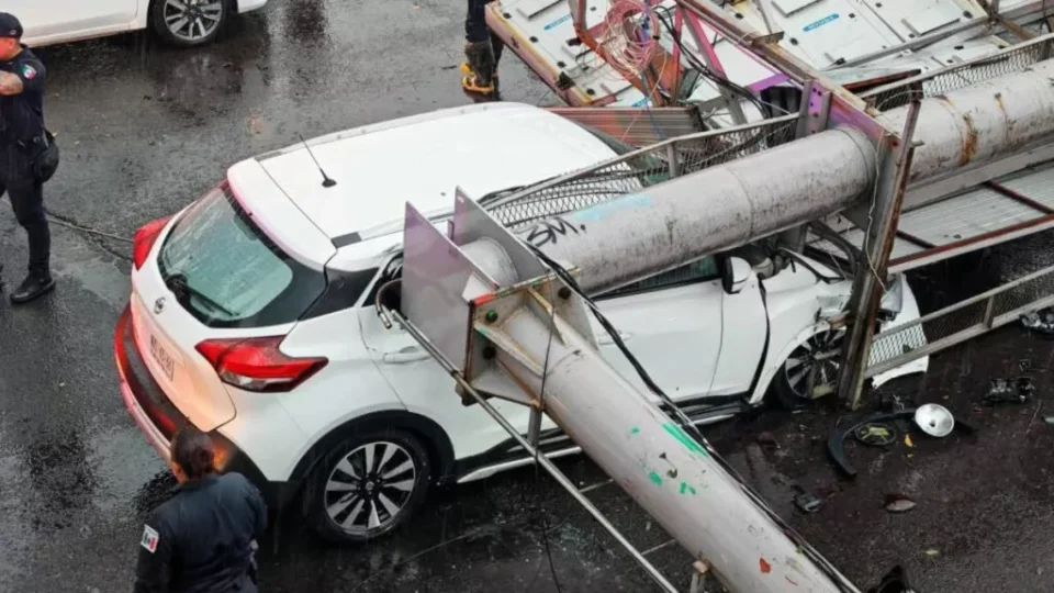 Una camioneta quedó aplastada al caer un anuncio espectacular debido a las lluvias, en el municipio de Tlalnepantla de Baz, en el Estado de México, sin que alguna persona resultara herida.