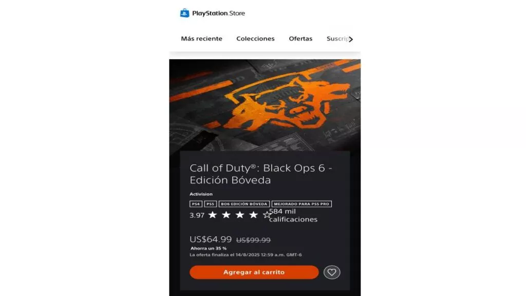 Un ejemplo es con el juego “Call of Duty: Black Ops 6 – Edición Bóveda”, con un costo inicial de 99.99 dólares, y rebajado a 64.99 dólares. Luego de esto, el usuario debe enviar el producto a su carrito y finalizar la compra.