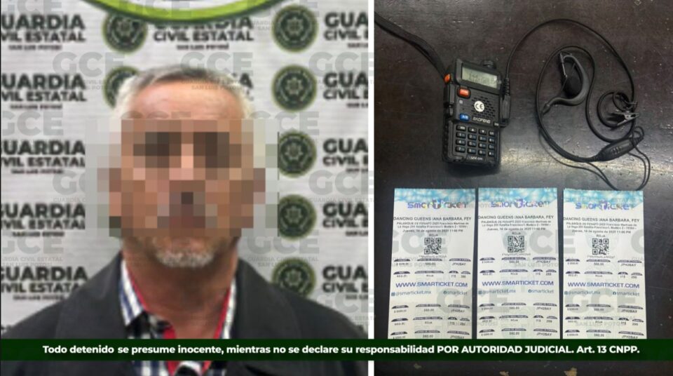 A través del dispositivo “FENAPO segura 2025”, agentes de la Guardia Civil Estatal detuvieron a un masculino que, presumiblemente, trataba de comercializar boletos para el palenque, a un precio superior a los establecidos en la taquilla, además de hacer uso ilícito de equipos de radio frecuencia.