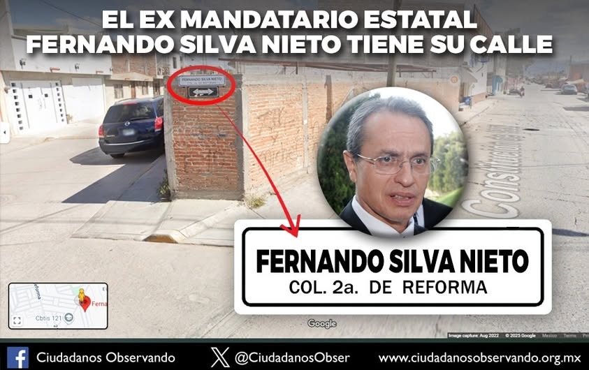 La organización Ciudadanos Observando dio a conocer que, también el ex gobernador de San Luis Potosí, Fernando Silva Nieto (1997-2003) tiene una calle con su nombre en la colonia 2a. de Reforma en el Municipio de Soledad de Graciano Sánchez, quien debió enfrentar la justicia por la enorme corrupción que caracterizó su terrible sexenio como lo sucedido en los invernaderos de Santa Rita.