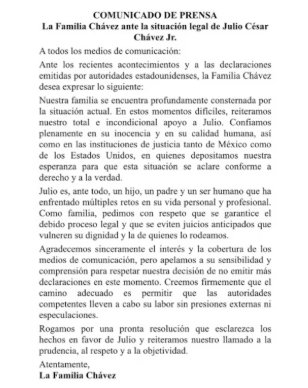 El legendario boxeador Julio César Chávez reaccionó a la detención de su hijo en un comunicado donde refrenda su apoyo a nombre de su familia: “Confiamos plenamente en su inocencia y en su calidad humana, así como en las instituciones de justicia tanto de México como de los Estados Unidos (…) Creemos firmemente que el camino adecuado es permitir que las autoridades competentes lleven a cabo su labor sin presiones externas ni especulaciones”.