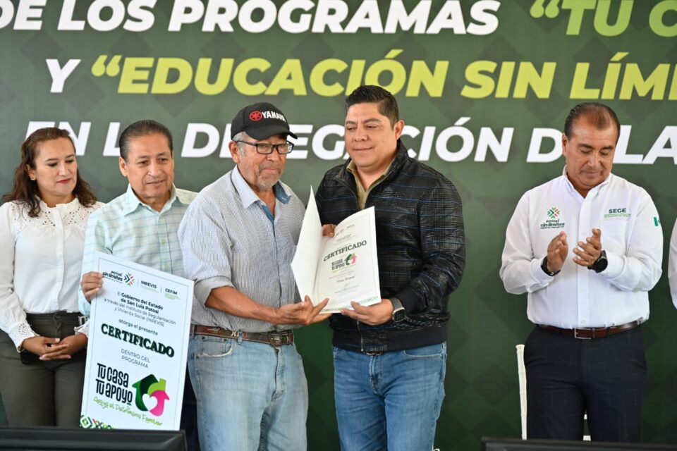 Además de los terrenos gratuitos, el Gobernador Ricardo Gallardo entregó el programa de Educación sin límites en la delegación de La Pila, para niñas y niños, que incluye útiles escolares, mochilas y zapatos, que beneficia a más de 500 mil estudiantes de educación básica de los 59 municipios.