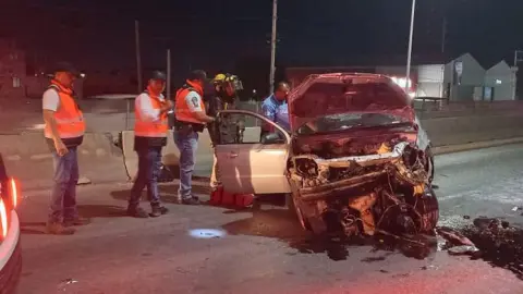 Un automóvil quedó destrozado por completo luego de chocar contra la contención en el puente del bulevar Rocha Cordero y la avenida Salk, un ocupante resultó con heridas graves y fue trasladado a un hospital a recibir atención médica requerida.