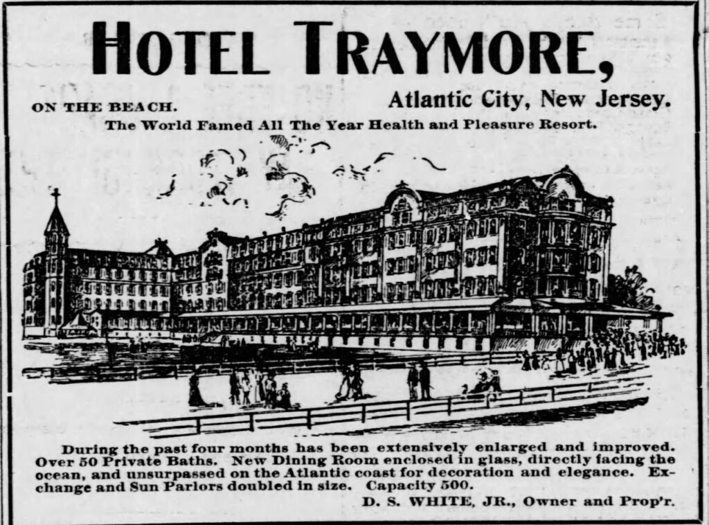 El anuncio del Hotel Traymore –“mundialmente famoso All The Year resort para la salud y el placer”– que incluyo como ilustración de esta kino-reseña, fue tomado de la página 2 de The Philadelphia Inquirer en su edición del Miércoles 21 de Febrero de 1900. Nos muestra la pujanza del sitio turístico apenas treinta años después de la muerte del doctor Pitney. Nota, querida lectora, la centralidad de la palabra placer… (Liga 6.)