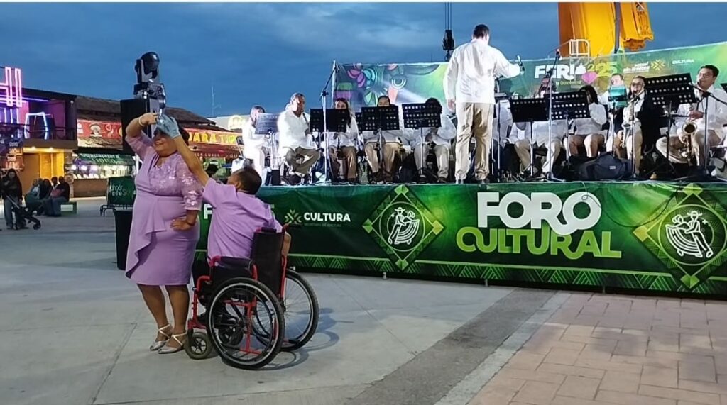En el Foro Cultural, este jueves 21 la programación artística comenzó con la presentación del Ensamble Arte Altiplano, originario de Matehuala, seguido por la Banda Sinfónica del Estado y el grupo Al Son del Danzón, quienes ofrecieron un espectáculo incluyente con la participación de Rocío Espericueta y Armando Figueroa, este último en silla de ruedas.