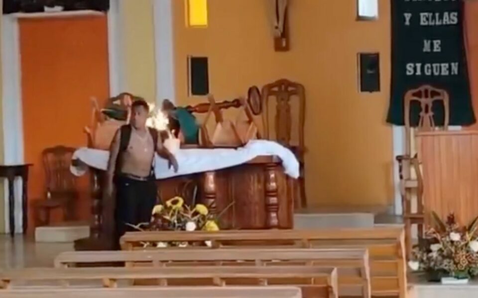 VIDEO | Hombre con machete en mano incendia altar principal de iglesia en Veracruz