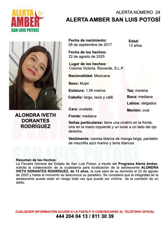 La Fiscalía General del Estado de San Luis Potosí (FGESLP) emitió una Alerta Amber para la búsqueda de Alondra Iveth Dorantes Rodríguez, adolescente vista por última vez el 22 de agosto de 2025, en la colonia Victoria, del municipio de Rioverde.